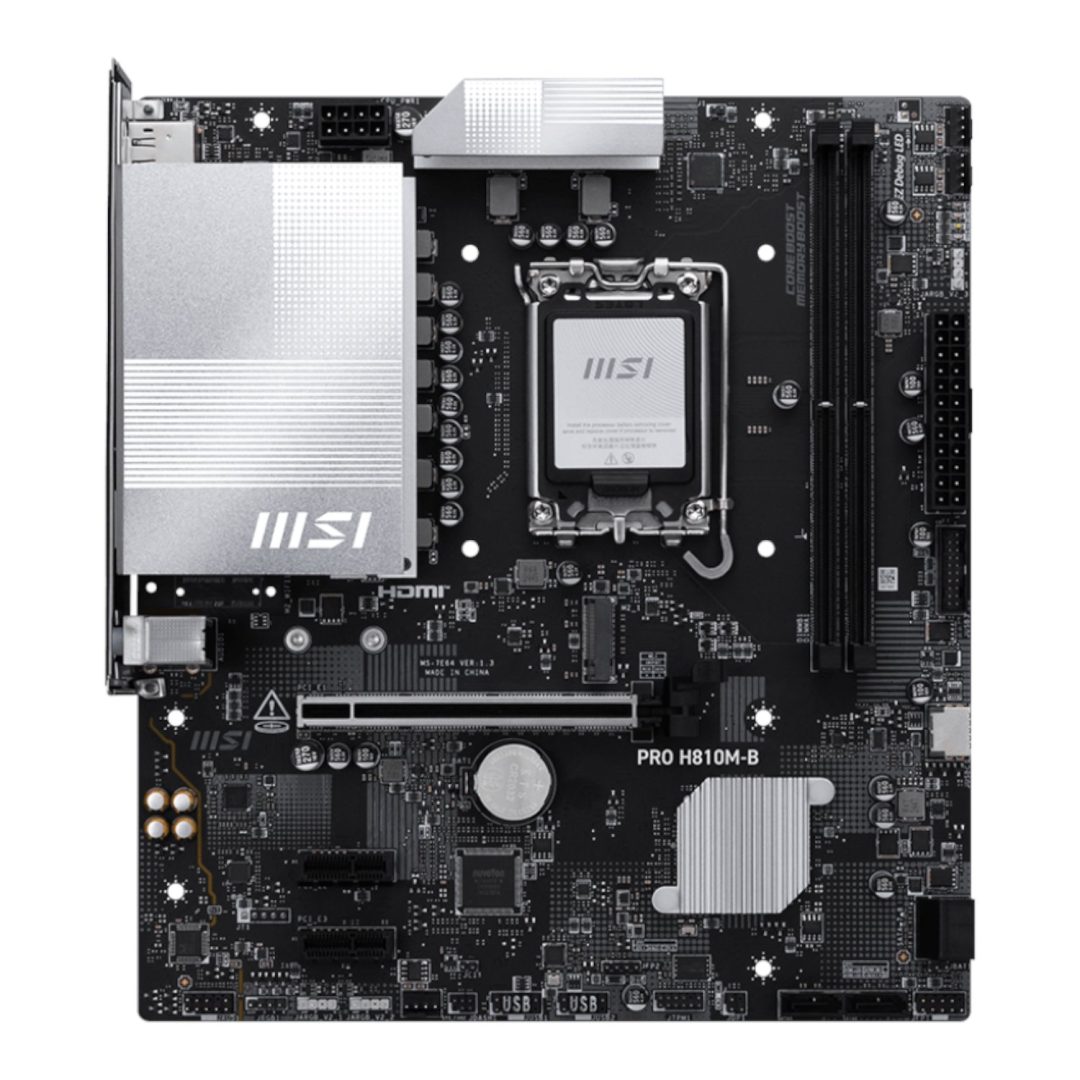The MSI PRO H810M-B motherboard is a Micro-ATX Intel H810 chipset board for the LGA1851 platform. It supports Intel Core Ultra 200 series processors and DDR5 memory. The LGA1851 socket is Intel’s current-generation platform, offering a longer upgrade path as new Core Ultra CPUs are released. The PRO series designation signals MSI’s focus on stability and reliability over extreme overclocking features.
